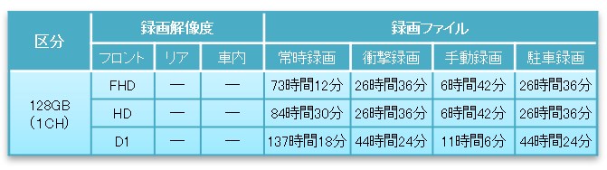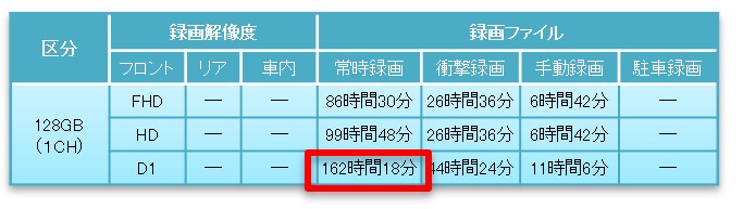 ※駐車監視設定なし、フロント、D1、常時録画が条件にした場合になります。